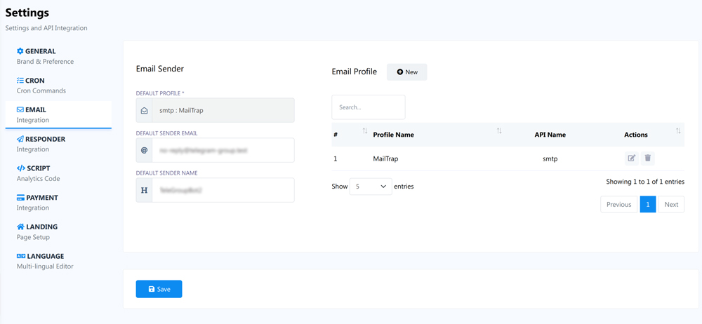 We support various email providers including SMTP, Mailgun, Postmark, SES and Mandril. To add a email profile to the application, click on the New button. Do not forget to `Save Changes`.